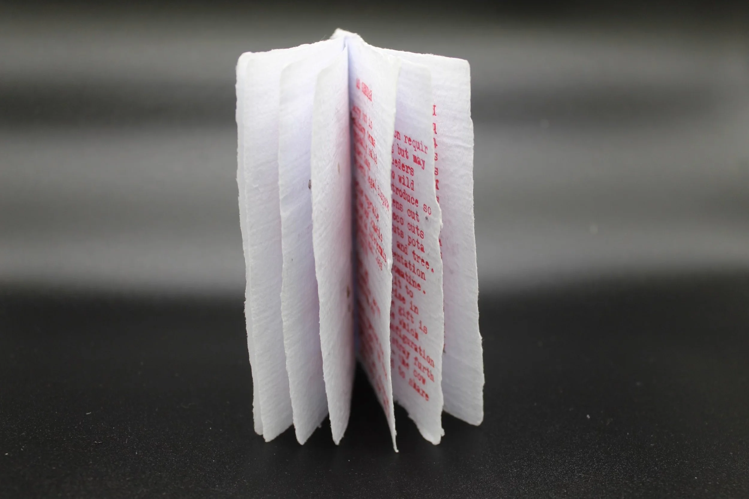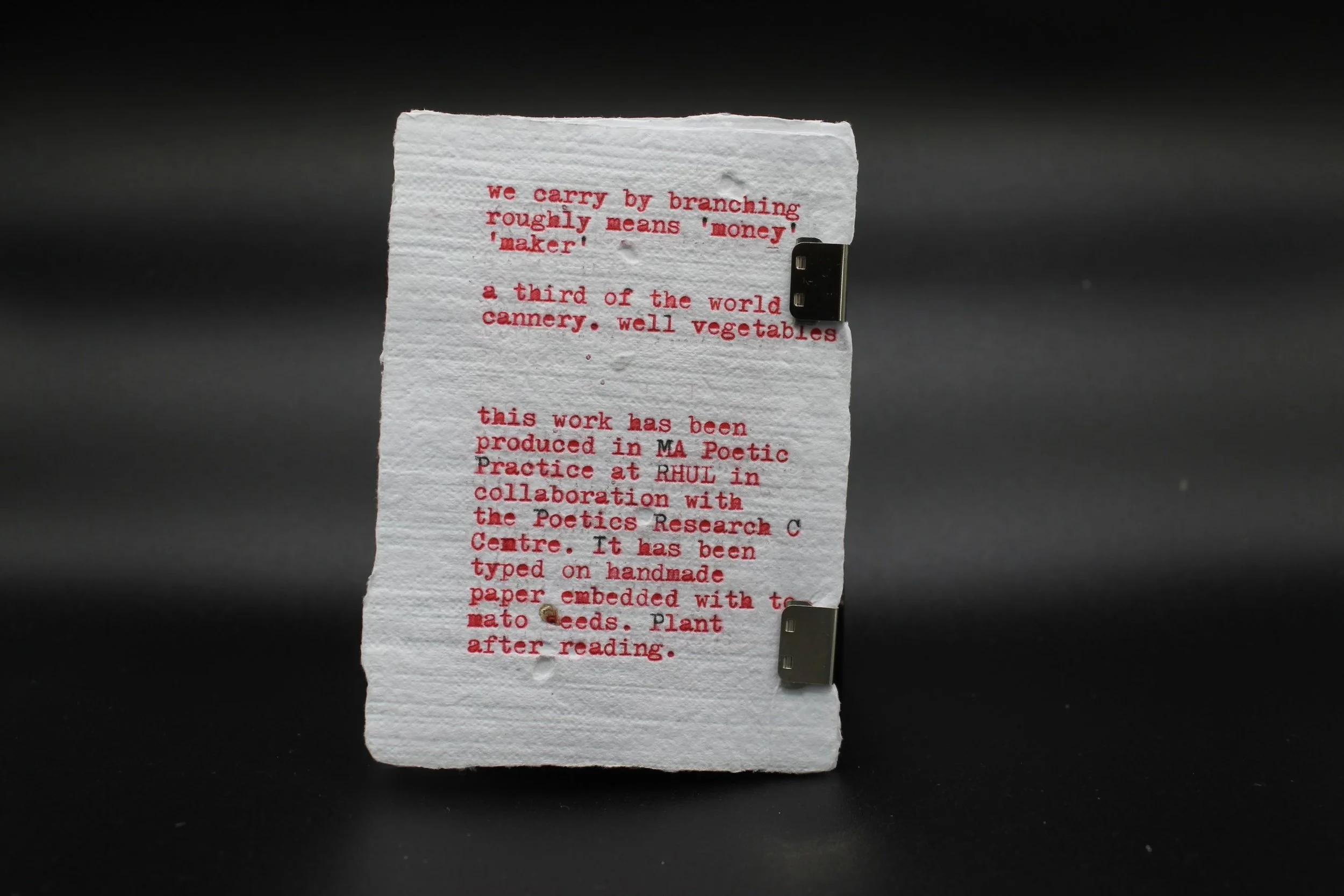Moneymaker is an approximately A6 sized booklet of handmade recycled paper, bound with reusable metal clips, and hand-typed with the Hermes 200-typewriter, using red ink. Embedded in the paper are tomato seeds, and should the booklet’s pages be planted, they would most likely produce a tomato plant. Within the booklet is contained a series of poems exploring our relationship to the tomato-plant, through imagining the tomato as name, number, gender, encounter, and finally the plant itself.